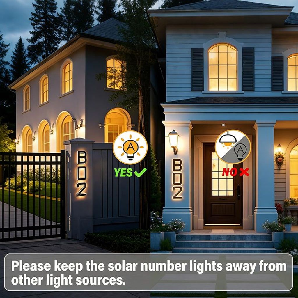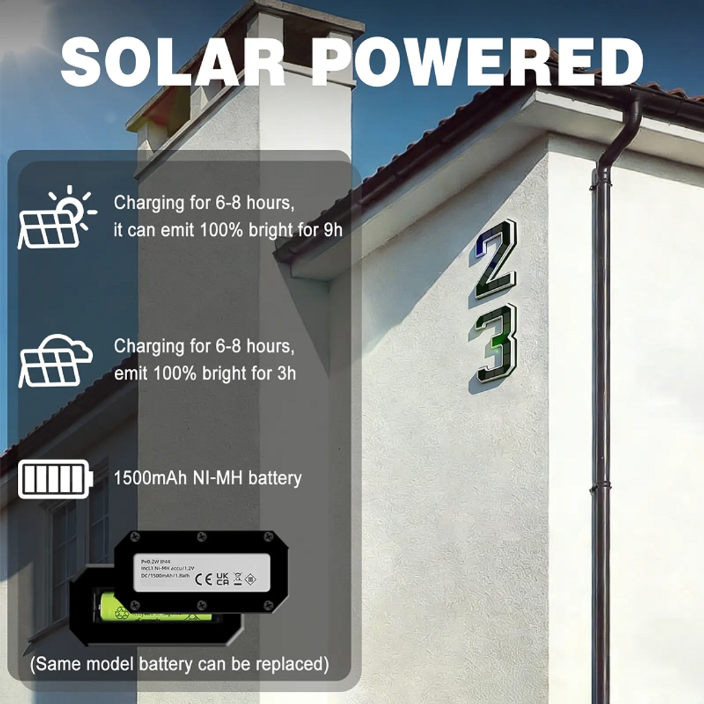 Solar-powered house number features a 1500mAh solar panel that charges in 6-8 hours under ample sunlight, providing 9 hours of illumination. The house number is clearly visible at night.