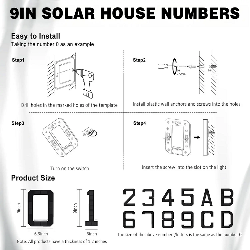 Perfect for decorating your house, garage, or front door, each 9-inch illuminated house number includes all mounting screws, a clear installation guide, and a drilling template for fast, hassle-free setup.